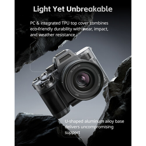 The cage features multiple parts that can be used independently, such as a hot shoe cover, baseplate, grip, and top protective cage, depending on your desired configuration. Its overall aluminum construction creates a durable and lightweight design, and soft, silicone pads on the interior protect the camera from scratches. Two strap slots are provided to add a separately available neck or hand strap.